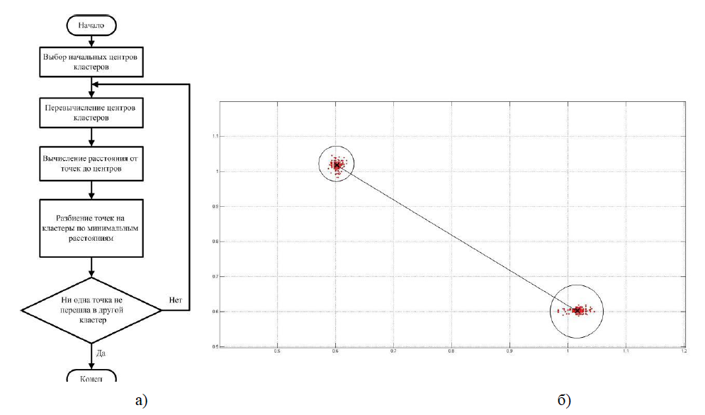 Далее к каждой полученной диаграмме применяется алгоритм кластеризации k-средних (блок-схема алгоритма представлена на рисунке 2а). После разделения множества точек диаграммы на кластеры, вычисляется Евклидово расстояние между центрами полученных кластеров. Результат этого шага представлен на рисунке 2 б, где окружностями указаны полученные кластеры, маркером в виде креста отмечены центры этих кластеров и прямой линией отмечено расстояние между кластерами.