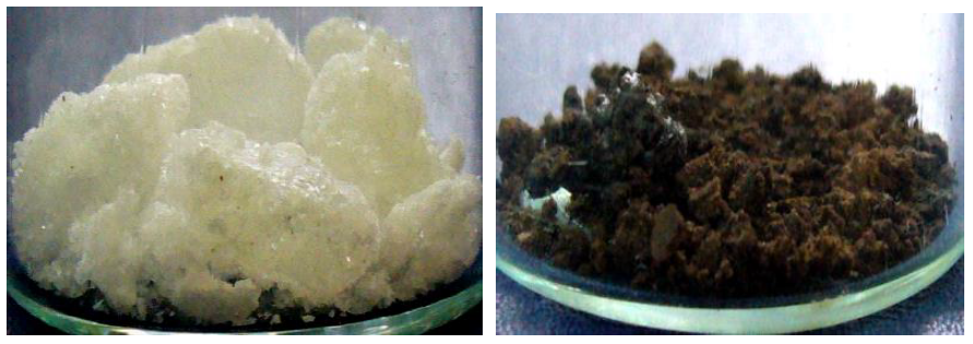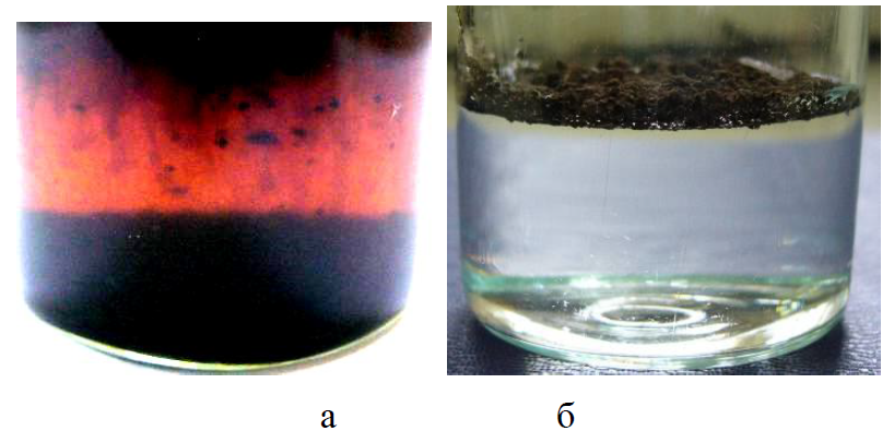 Асфальтены – это твердые аморфные вещества от темно-бурого до черного цвета (рис. 3). Плотность выше 1 г/см3. Растворяются в ароматических углеводородах (рис. 4, а), не растворимы в БГС (рис. 4, б). При нагревании размягчаются, но не плавятся, в нефти присутствуют в виде коллоидов. Выпадают в осадок при разведении нефти в БГС (1:20).