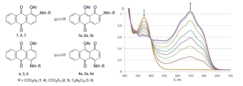 Для получения фотохромных 1-арилокси-2- и 4-амино-9,10-антрахинонов были проведены реакции ацилирования по аминогруппе [12]. После кипячения аминопроизводных в толуоле с хлористым бензоилом, пентафторбензоилхлоридом, а также с цианурхлоридом (2,4,6-трихлор-1,3,5-триазин) и хроматографической очистки с высоким выходом были выделены целевые продукты 1-6.