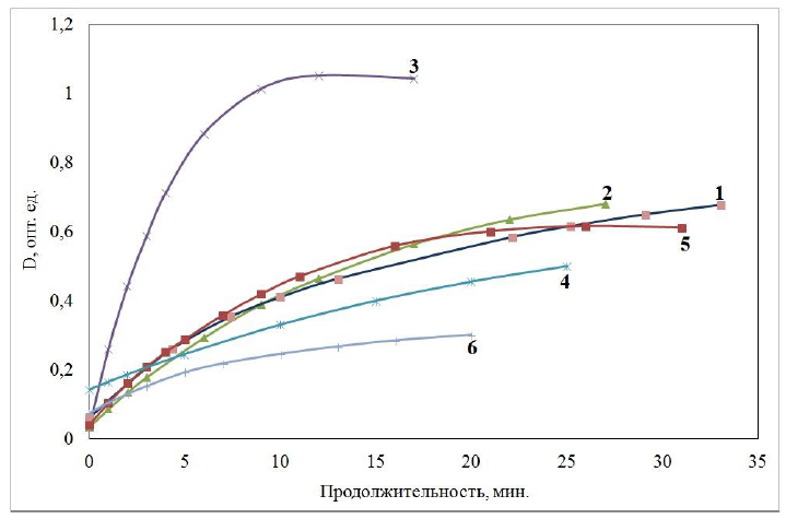 Для сравнения светочувствительности полученных соединений была измерена скорость их фотоизомеризации. Для этого регистрировали изменение оптической плотности толуольных растворов соединений 1-6 через определенные промежутки времени до достижения максимального значения оптической плотности. Полученные зависимости представлены на рисунке 2.