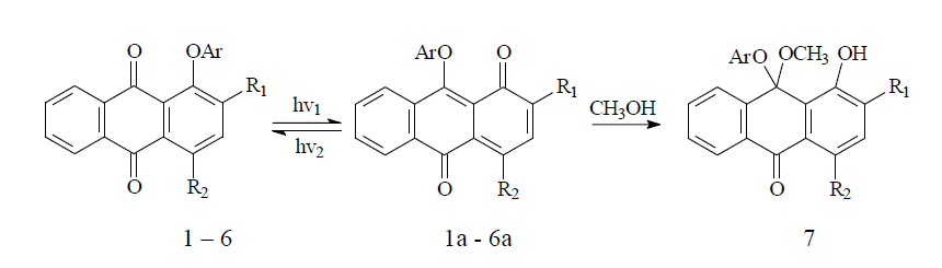 Соединения 1а-6а были получены фотохимически при облучении соответствующих производных 1-арилокси-9,10-антрахинона (С ~ 10-4 моль/л) в толуоле с последующей добавкой метанола (10-3–10-1 моль/л). Образующиеся при фотолизе ана-хиноны вступают в реакцию с метанолом с образованием соединений, имеющих интенсивную полосу поглощения в ближней УФ-области (λmax~350–390 нм).