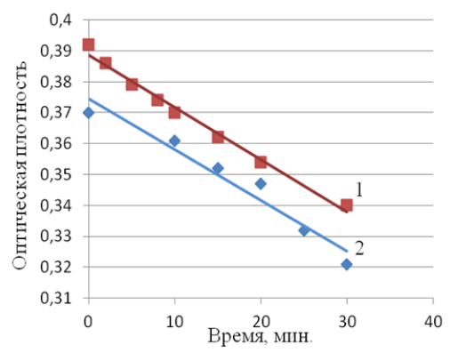 Рисунок 3 – Изменение оптической плотности раствора5а в толуоле при добавлении метанола (1) и этанола (2)