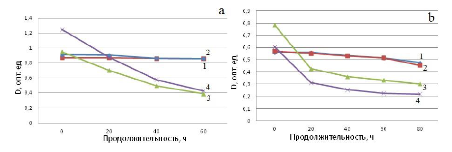 Рисунок 4 – Кинетика темновой деструкции 5а в ПВА (a), в ПС (b) 1 – воздух, прогрев 150°C; 2 – эксикатор, прогрев 150°C;3 – воздух, без прогрева; 4 – эксикатор, без прогрева
