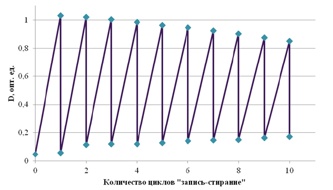 Число циклов определяли экспонированием полимерного слоя светом с λ= 365 нм до оптической плотности фотоформы ~ 1,0 с последующим проведением обратной реакции, при облучении видимым светом с λ = 530 нм до исходной плотности фотоформы.