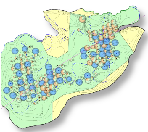 На рисунке 3 изображена карта текущего состояния разработки основного пласта Y, где показано расположение добывающих и нагнетательных скважин. Карта построена на основании текущего дебита нефти и воды скважин. Непосредственно на карте значение дебита выражается радиусом круга, вычерчиваемого на плане расположения скважин.