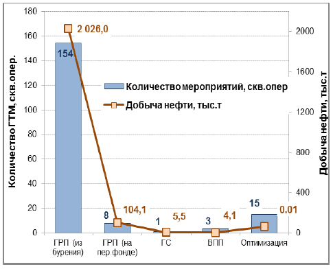 Интенсификация добычи нефти тесно связана с проведением геолого-технических мероприятий (ГТМ). По состоянию на начало 2013 года проведено 181 ГТМ на 158 скважинах. Ежегодный объем проведения ГТМ составляет 2–63 скважино-операций, дополнительная добыча нефти с учетом переходящего эффекта равна 4,3–752,8 тысяч тонн и изменяется по годам от 36,9 до 92,4 %, в среднем составляя 80,1 % от всей годовой добычи по месторождению. Основной вид ГТМ на месторождении – это гидравлический разрыв пласта (ГРП) в новых скважинах. В таблице 2 и на рисунке 4 отражены виды ГТМ, проводимые на месторождении Х за все время разработки.