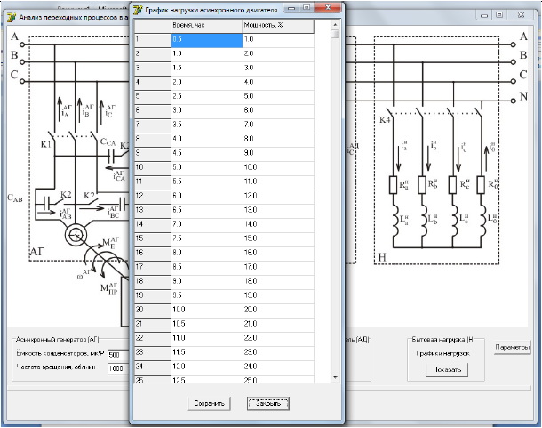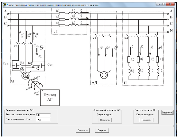 На основании системы дифференциальных уравнений (1) с использованием языка программирования Object Pascal и среды разработки Delphi 7 реализован программный продукт «As_G», позволяющий выполнять расчёт переходных процессов в электроэнрегетической системе на базе АГ. Предлагаемый программный продукт составлен на основании ранее разработанного программного продукта, предназначенного для расчёта переходных процессов в асинхронном двигателе [4]. Ниже приводится описание работы предлагаемого программного продукта, реализующего расчёты для асинхронной машины АИР315S6, работающей в режиме генератора, и которая имеет следующие паспортные данные (таблица 1).