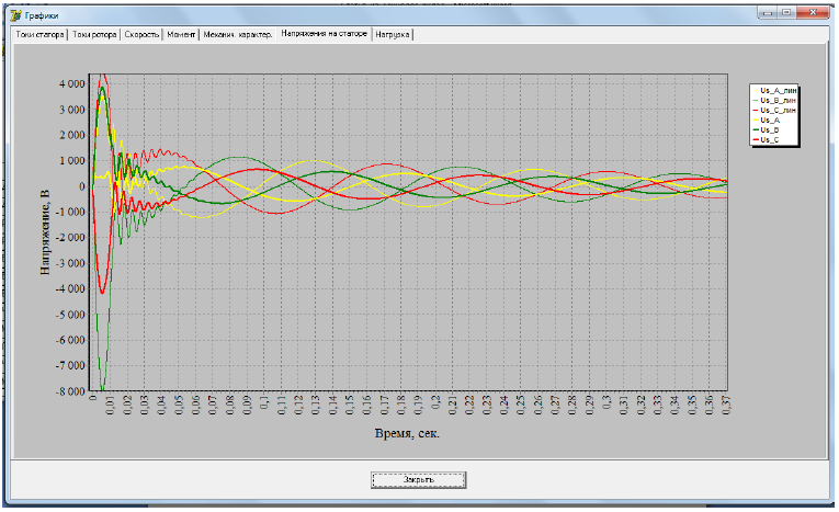 Для выполнения расчётов переходных процессов в рассматриваемой электроэнрегетической системе на базе АГ АИР315S6 необходимо определить параметры его математической модели (1). Методика определения параметров математических моделей электротехнических устройств подробно излагается в работах [3] и [5] и реализована в виде программного продукта [2]. Программный продукт [2] также позволяет определить параметры математической модели асинхронной машины по паспортным данным. На основании программного продукта [2] могут быть получены следующие параметры математической модели асинхронной машины АИР315S6 (таблица 2).