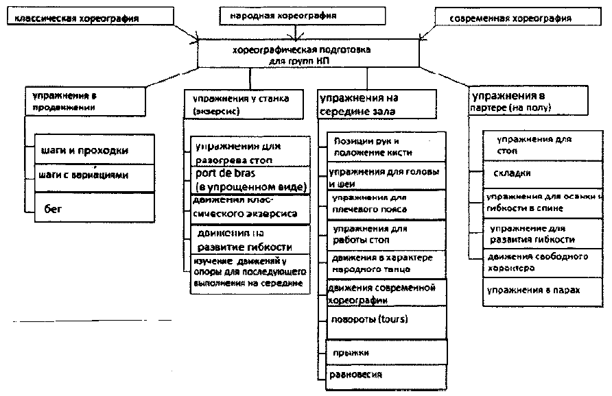 Подводя итог вышесказанному, в качестве модели хореографической подготовки для акробатов начального этапа подготовки можно рекомендовать планирование двигательных заданий по следующим структурным блокам (рисунок).