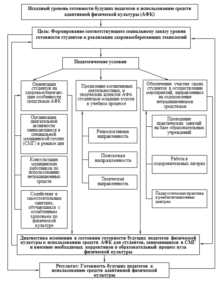 The process of formation of readiness of students of physical culture to use of health funds for the students with weakened health, it is advisable to implement on the basis of the model, which characterizes the educational conditions to the manifestation of cognitive activity, creative aspects of adaptive physical culture. Increase of the efficiency of formation of the commitment are created based on real levels with a guide for the achievement levels, the corresponding social ordering. While in the course of implementation of the model is diagnosis of changes of professional readiness of students in the test aspect, and based on its results, are the necessary adjustments in the educational process of the University.