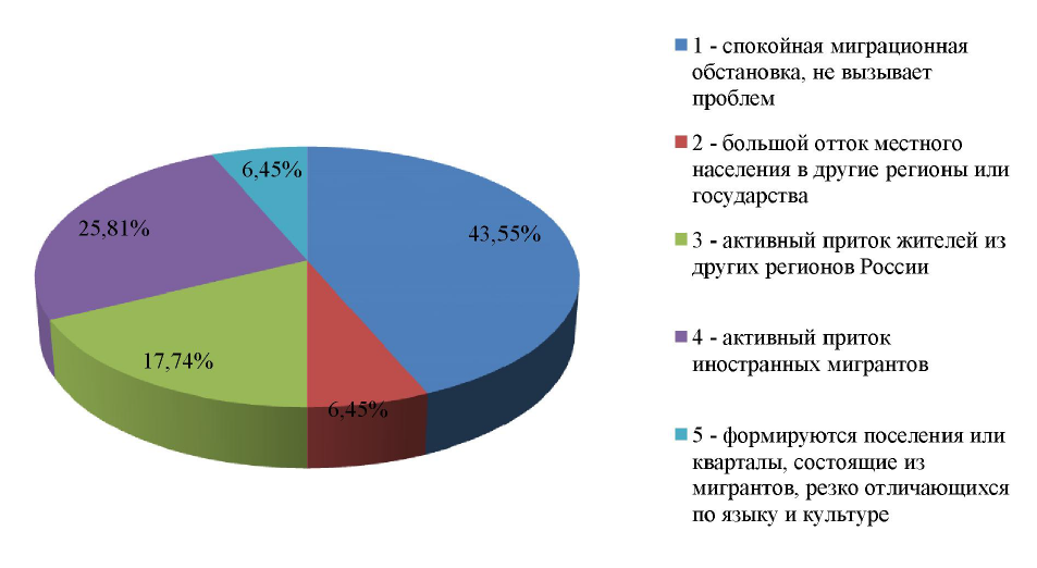 На вопрос «что из перечисленного характерно в вашем регионе?» почти половина респондентов (43,55 %) отметили спокойную миграционную обстановку, не вызывающую проблем (рис. 1).