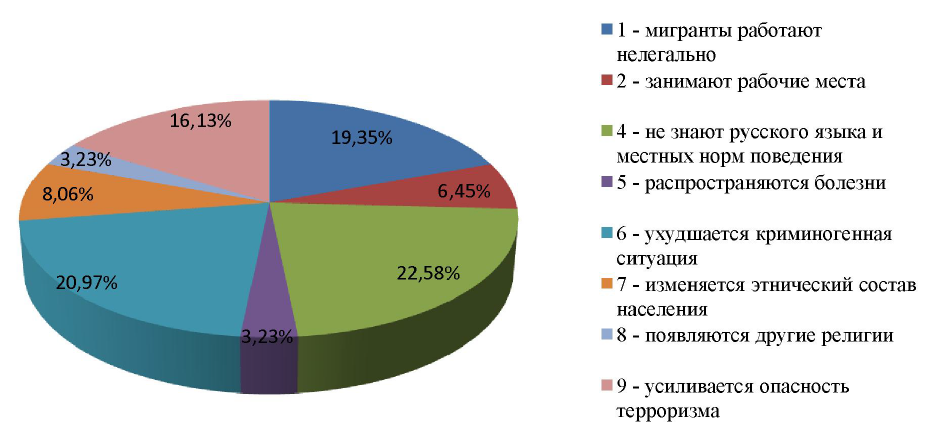 На вопрос «какие из следующих представлений о мигрантах существуют в вашем регионе?» доминировали следующие ответы: «мигранты работают нелегально» (19 %), «не знают русского языка и местных норм поведения» (22,6 %), «ухудшается криминогенная ситуация» (20,1 %), «усиливается опасность терроризма». Опасения граждан по нормам поведения и криминогенной ситуации подтверждает статистика за девять месяцев 2017 г.: количество возбужденных уголовных дел в отношении иностранных граждан составило 76 (в два раза больше по сравнению с прошлым годом), выявлено административных правонарушений – 26227 ед. (рост – 30,6 % по сравнению с 2016 г.) [3].