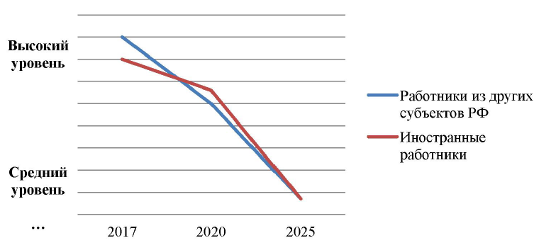 Как видно из графика, в средне- и долгосрочной перспективе потребность в иностранных работниках и работниках из других субъектов Российской Федерации снижается к уровню «низкий».