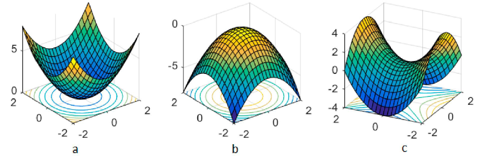 Рисунок 1 – Критические точки функции: а – точка минимума, b – точка максимума, с – седловая точка