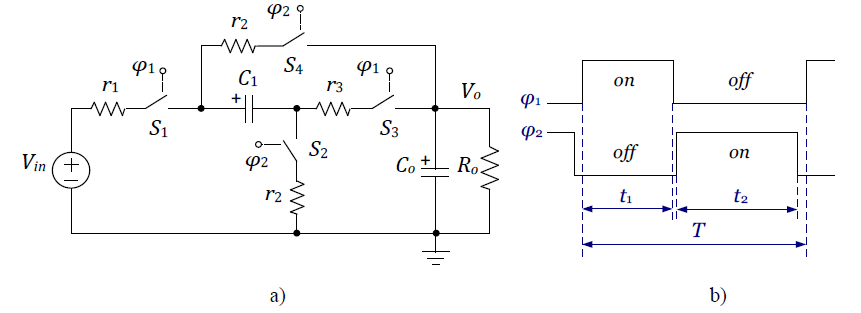 Let us consider the SCC shown schematically in Fig. 1(a). It comprises four switches with on-resistances . The corresponding pair of switches is turned on/off by two non-overlapping clocks and shown in Fig. 1(b). Thus, during the capacitor is charged by through , and then, during , is discharged to the load through Thus, we have two topologies, which are considered separately in Sections II. Applying to each topology the Kirchhoff’s voltage and current laws (KVL and KCL), we write a system of two first-order differential equations. These equations are then solved using the Laplace transform. The solution for the first topology defines the initial conditions for the second one. This enables us to compose a system of two first-order difference equations, which is solved using the Z-transform. Thus, for a given period, , we know the initial values of state variables and functions according to which these variables change. This is the solution is closed form.