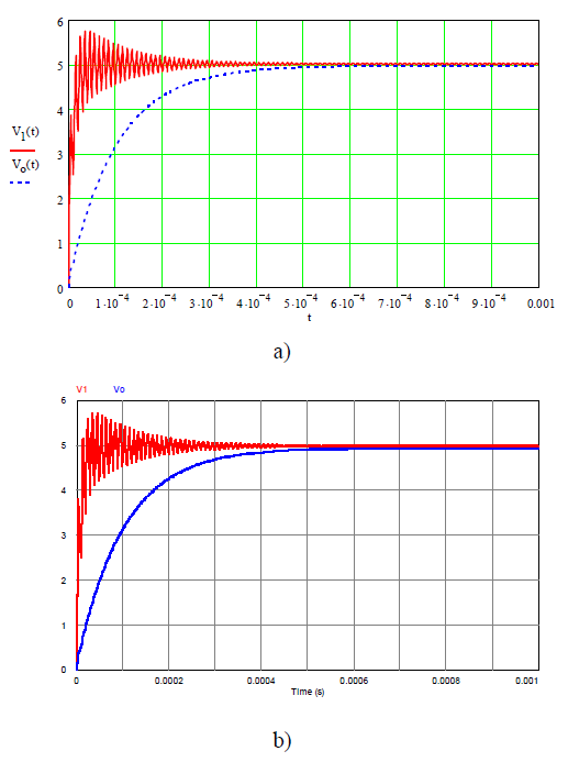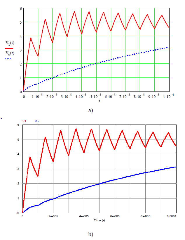 Fig. 6: Voltages across and for , MathCAD (a) and PSIM (b). The horizontal scale is , i.e. each division is .