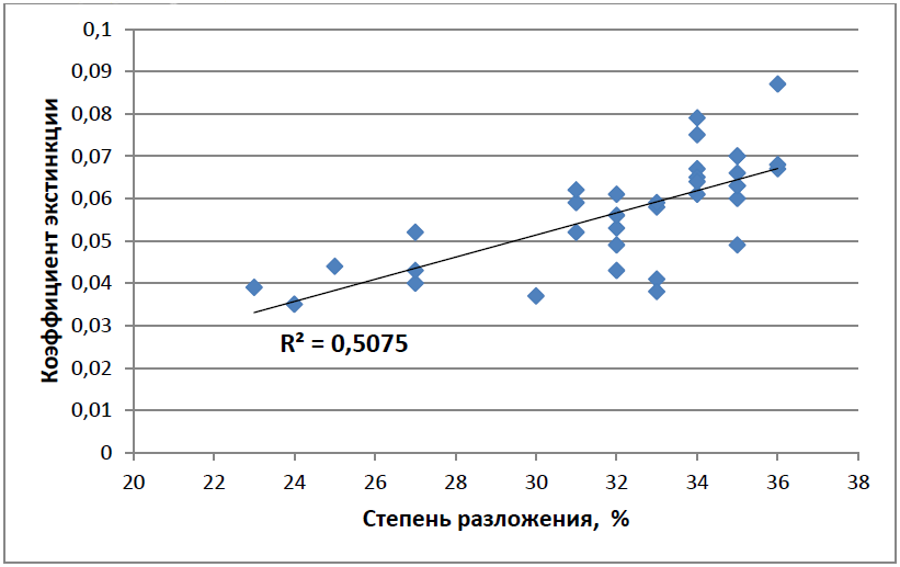 Рисунок 7 – Корреляционная зависимость коэффициентов экстинкции гуминовых кислот травяно-сфагновых торфов от степени разложения