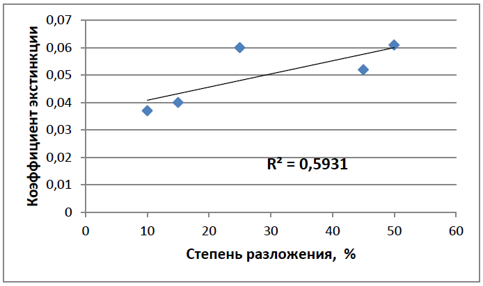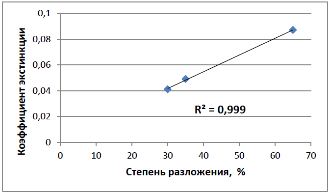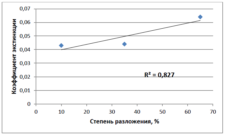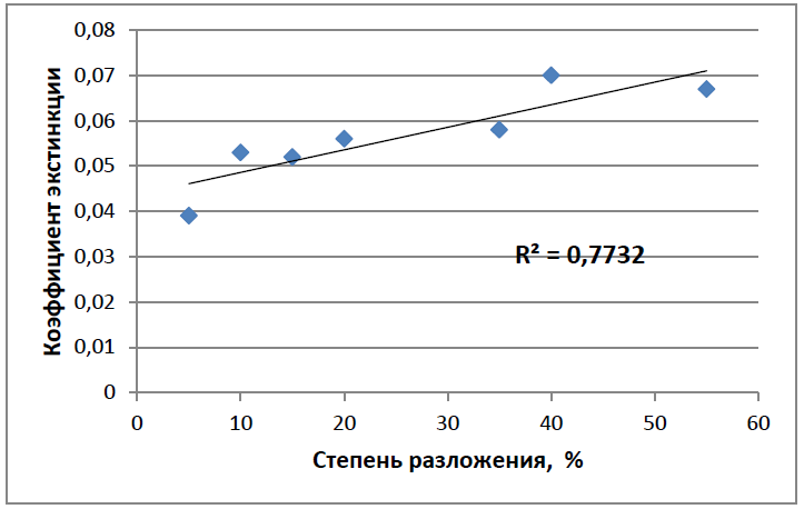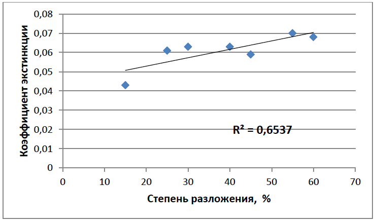 Рисунок 4 – Корреляционная зависимость коэффициентов экстинкции гуминовых кислот древесныхторфов от степени разложения