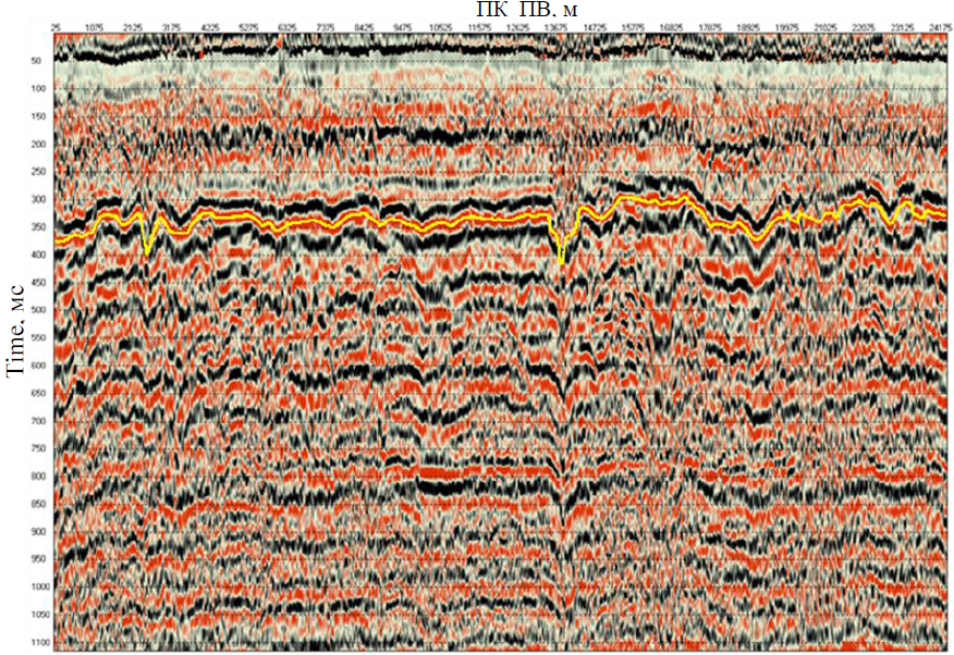Рисунок 1 – Корреляция кровли ММП (желтым цветом) по данным МОВ ОГТ