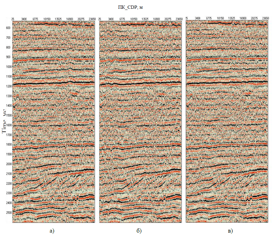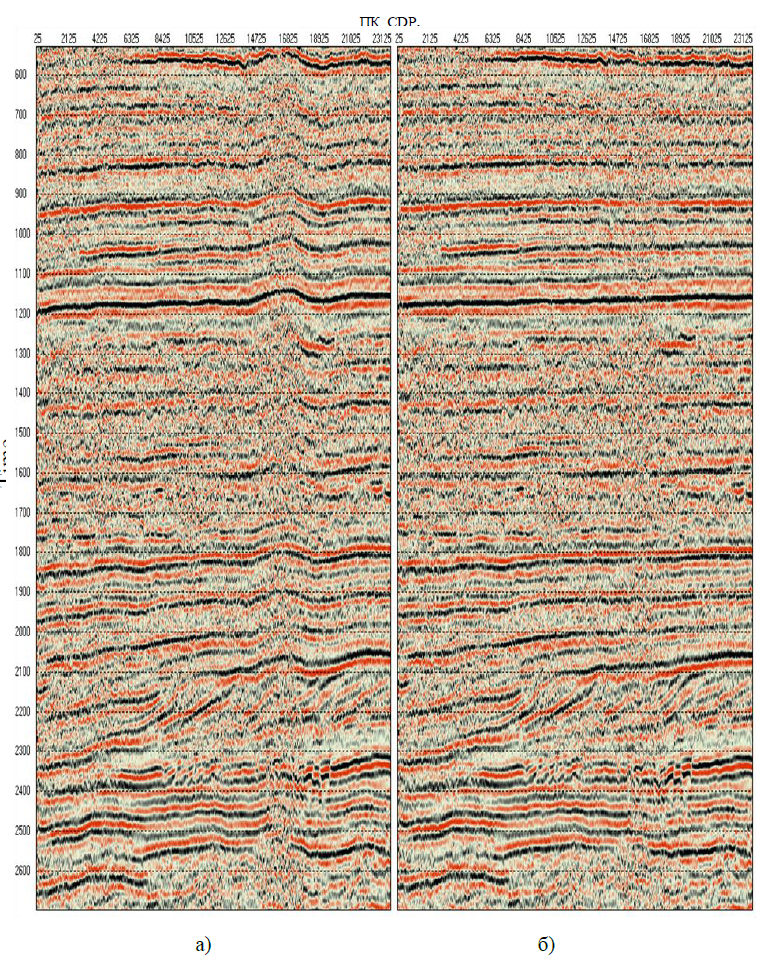 На рисунке 5 представлены: предварительный временной разрез (рис. 5, а) исследуемого профиля МОВ ОГТ 2D, до введения статических поправок за влияние высокоскоростной аномальной зоны, и финальный временной разрез (рис. 5, б), с высокочастотной коррекцией статических поправок.