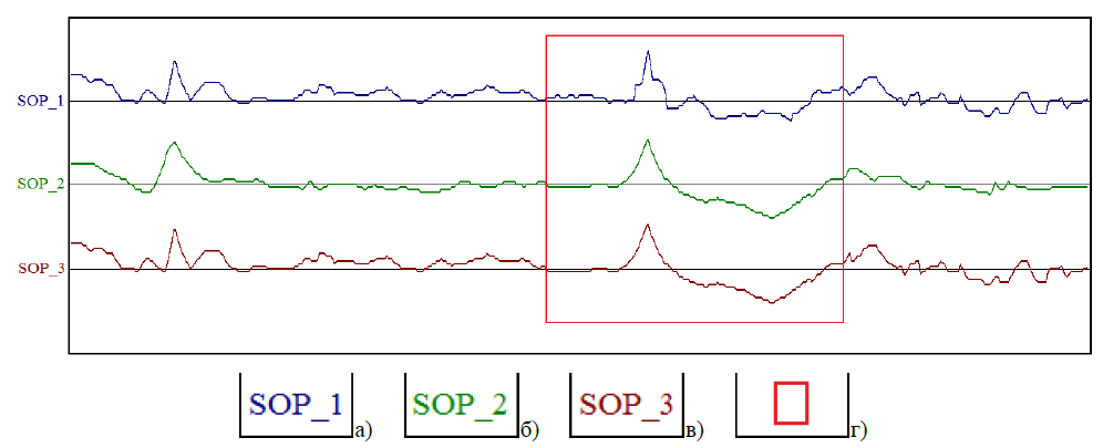 На временном разрезе (рис. 3, в), смоделированном подобным образом, выбранный опорный горизонт позволяет уверенное субгоризонтальное прослеживание, с полным компенсированием скоростной аномалии.