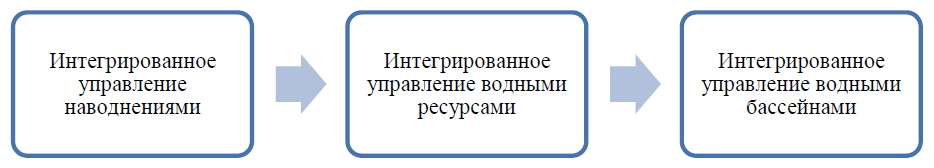 Данная концепция является составной частью системы управления, которая подразумевает многоуровневый подход, состоящий из интегрированного управления наводнениями, которое переходит к интегрированному управлению водными ресурсами (ИУВР) и на более высоком уровне к интегрированному управлению водными бассейнами (рис. 1).