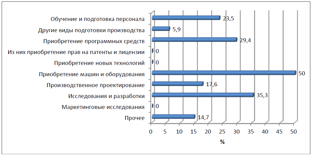 Рисунок 1 – Удельный вес организаций, осуществлявших отдельные виды инновационной деятельности, в общем числе организаций, осуществляющих технологические инновации в 2013 г. ХМАО [4]
