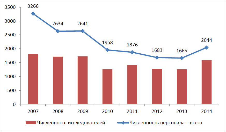 Несмотря на то, что в ХМАО имеется современная инфраструктура инновационной сферы, численность персонала, занятого исследованиями и разработками за 2007–2013 гг. сокращалась. Положительная динамика данного показателя наблюдалась только за 2014 г. (рис. 2).