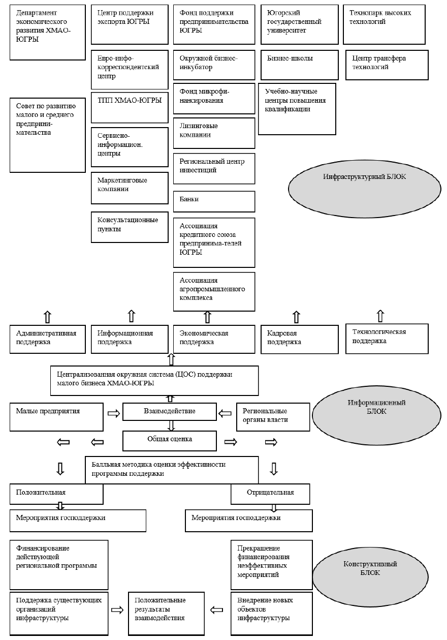 Данная принципиальная схема механизма государственной поддержки малого бизнеса в Ханты-Мансийском автономном округе – Югре состоит из трех блоков: инфраструктурного, информационного и конструктивного. В инфраструктурный блок входит «Централизованная окружная система поддержки малого бизнеса ХМАО-Югры», а также организации, образующие инфраструктуру поддержки малого бизнеса. Информационный блок включает мониторинг и оценку эффективности механизма государственной поддержки малого бизнеса. Оценка эффективности механизма поддержки малого бизнеса может быть как положительной, так и отрицательной. Мониторинг и оценку эффективности мероприятий господдержки малого бизнеса в северных регионах может осуществлять «Исследовательский центр развития малого бизнеса» на основе предложенной балльной методики оценки эффективности целевых программ поддержки малого бизнеса. В конструктивный блок входят мероприятия: финансирование действующих целевых программ и поддержка существующих объектов инфраструктуры или прекращение финансирования неэффективных мероприятий и внедрение новых объектов инфраструктуры (ликвидация неэффективных объектов инфраструктуры).
