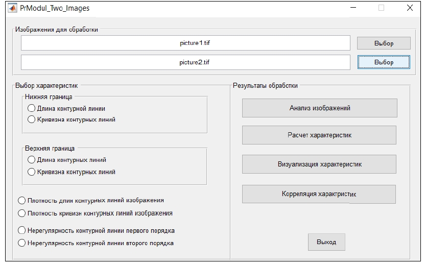 В целях вычисления таких топологических характеристик цифрового изображения как длина и кривизна контурных линий изображения, а также удельные плотности длин и кривизн, нерегулярности контурной линии первого и второго порядков, в среде Matlab был разработан программный комплекс.