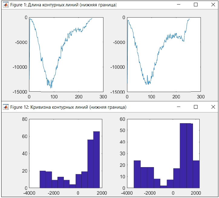 В качестве примера, на рисунке 5 представлены результаты построения графиков длины контурных линий и гистограмм кривизны контурных линий, вычисленных по нижним границам для двух рассматриваемых изображений.