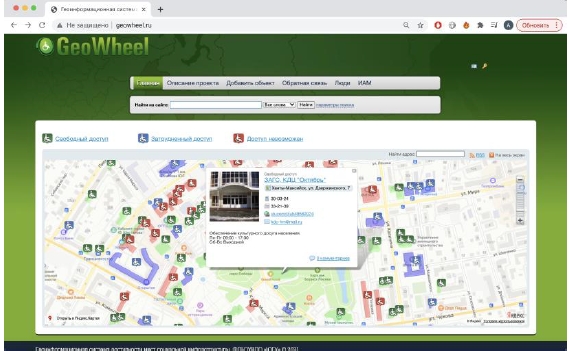 - Спроектирована и реализована интерактивная социально-ориентированная геоинформационная система, предназначенная для получения информации об объектах социальной инфраструктуры, направленная на удовлетворение потребностей маломобильных групп граждан и людей с ограниченными возможностями. На рисунке 1 представлен скриншот созданной геоинформационной системы для МГН, опубликованный в сети Интернет по адресу geowheel.ru [3].