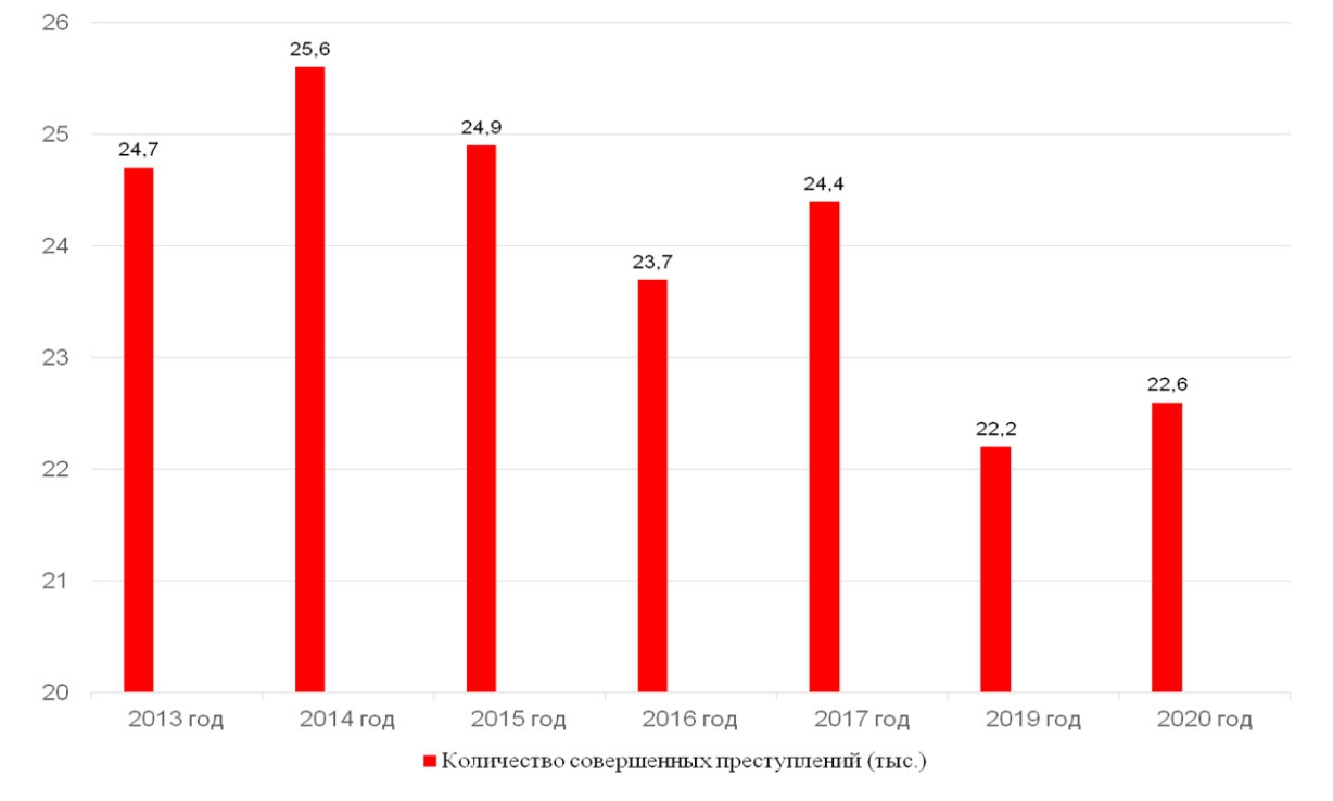 Рисунок 2 – Количественные показатели уровня преступности в России за 2013–2020 гг.
