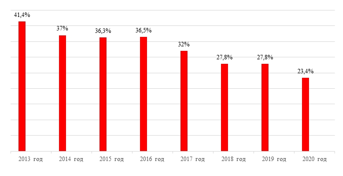 Рисунок 4 – Соотношение количества осужденных за экологические преступления к количеству возбужденных уголовных дел в России за 2013–2020 гг.