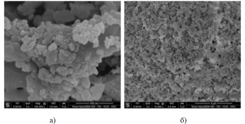 Рисунок 2. Микроструктура ЗРШ 350 ºС (а) и ЗРШ 800 ºС (б), при помощи электронно-сканирующего микроскопа (увеличение 106)