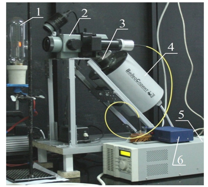 (1 – образцовая температурная лампа ТРУ-1100-2350; 2, 3, 4 – элементы калибруемого тепловизионного устройства; 2 – стереомикроскоп МБС-10; 3 – полосовой светофильтр SL-725-50; 4 – скоростная камера «ВидеоСпринт»; 5 – программируемый источник тока PSH-2035; 6 – осветитель)