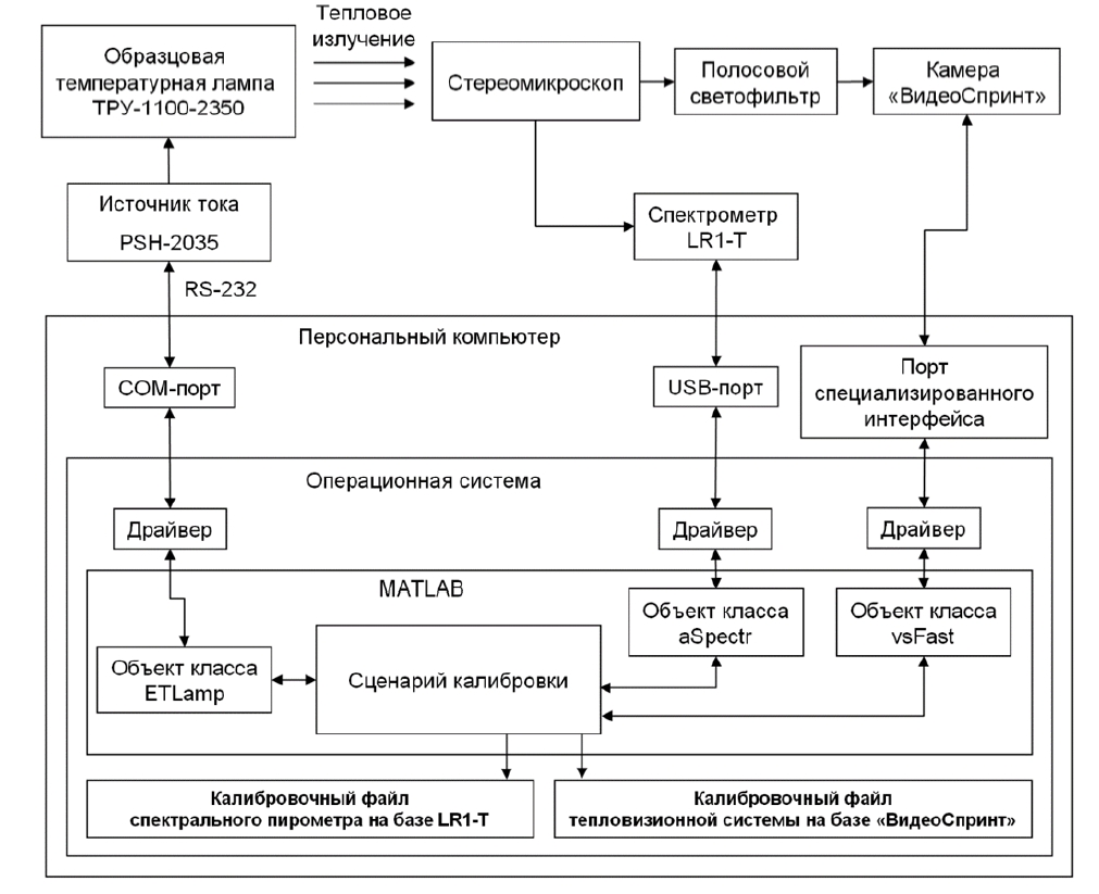 Исходный калибровочный стенд ранее построен на базе концепции виртуальных приборов. В качестве аппаратных средств в нем задействованы программируемый источник тока PSH-2035, образцовая температурная лампа ТРУ-1100-2350 и персональный компьютер (рис. 1).