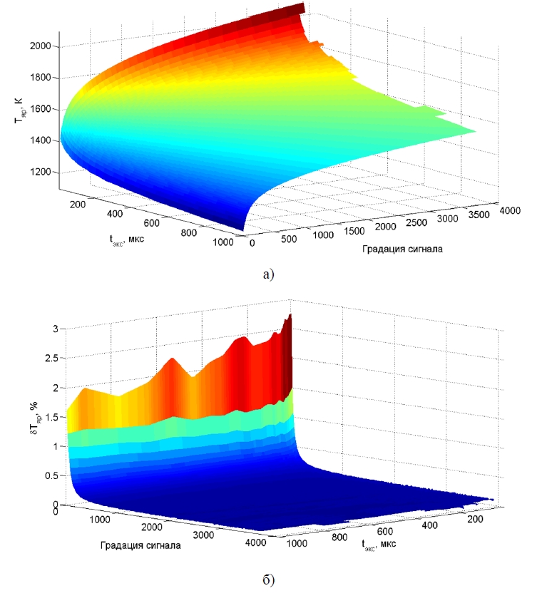 Результатом выполнения сценария калибровки тепловизионной системы, производящей монохромные измерения, является зависимость яркостной температуры и ошибки ее определения от времени экспозиции и уровня сигнала (рис. 4).