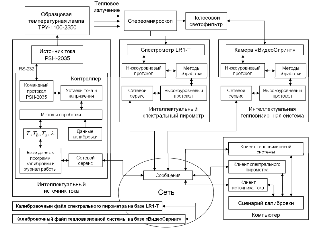 Измерительный комплекс на общей для всех виртуальных приборов вычислительной платформе (рис. 2) имеет ряд недостатков, связанных с ограниченностью его ресурсов (памяти, процессорного времени, пропускной способностью шины данных и др.). Кроме того, для определенного класса измерительных приборов требуются особые аппаратные средства, которые, как правило, отсутствуют в универсальных компьютерах. В настоящее время решить указанную проблему можно с помощью встраиваемых микроконтроллеров, где совмещена работа процессора общего назначения и специальных функциональных блоков, обеспечивающих преобразование как цифровых, так и аналоговых сигналов. Это решение позволяет отказаться от ряда промежуточных интерфейсов, ограничивающих быстродействие измерительного прибора, и подстроить аппаратные средства вычислительной платформы под особенности методов обработки данных. За счет индивидуальных вычислительных ресурсов у прибора может быть организована высокоуровневая сигнальная система, сводящая к минимуму трафик данных, которыми он обменивается с другими устройствами измерительного комплекса. Описанный подход лег в основу разработки интеллектуального спектрального пирометра [27–30]. Так, трафик его первичных данных из модуля АЦП в память микроконтроллера составляет 4 Мбит/с. Однако после определения температуры и ЯСКИ на единственной длине волны он сокращается почти на 3 порядка и на входе, действующей в приборе сверточной нейронной сети, составляет около 10 кбит/с. Распознавание фазовых переходов по зависимости ЯСКИ от времени средствами ИИ сводит объем выходных данных спектрального пирометра к десяткам бит, которые в локальной сети можно передавать между устройствами за единицы микросекунд. Таким образом, с помощью интеллектуальных способностей (вычислительных ресурсов и методов обработки данных) спектрального пирометра организуется его высокоуровневая сигнальная система, которая позволяет сообщать о событиях фазовых переходов (характерная температура и момент времени структурных изменений в теплофизическом процессе) во внешнюю среду только посредством сетевых коммуникаций. Обобщение данного подхода приводит к концепции сетевых интеллектуальных приборов. Следуя ей авторы разработали схему стенда температурной калибровки тепловизионных и спектральных приборов, предназначенных для мониторинга высокотемпературных быстропротекающих процессов синтеза материалов, покрытий и изделий (рис. 5).