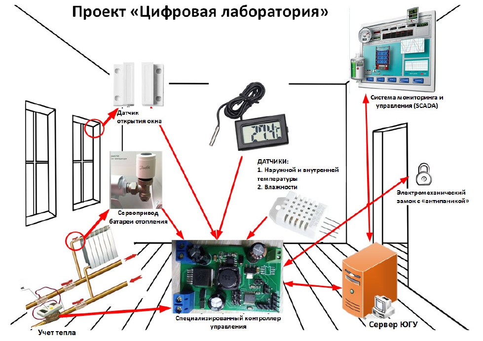 Для определения теплопотерь в помещении и, как следствие, возможной экономии потребления тепла была создана «цифровая лаборатория» на базе аудитории 450 3-го корпуса Югорского государственного университета. Общая структурная схема проекта показана на рисунке 1.