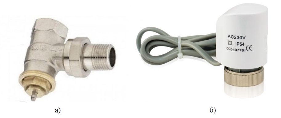В качестве исполнительного механизма для ограничения потока тепла изначально был установлен обычный кран, который не позволяет подключиться к автоматическому терморегулятору. Для решения этой проблемы ручной вентиль был заменен на клапан (рисунок 5а), который будет применяться совместно с сервоприводом (рисунок 5б). Сервопривод такого типа осуществляет бесшумное управление (в отличие от моторизированный вентилей) за счет встроенного нагревателя и работающего по принципу расширения от нагрева с последующим давлением на клапан. Время открытия/закрытия лежит в пределах 3–5 минут.