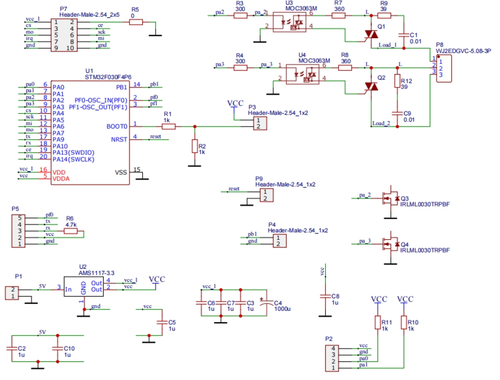 По результатам опроса датчика внутренней температуры показания передаются в функцию TempRegulator (1, *t1) в которой произойдёт сравнение текущей температуры с желаемой с учетом гистерезиса, и в результате будет принято решение о включении или отключении подачи тепла в батарею отопления. Так как для управления сервоприводом используется напряжение 220В, то для платы предусмотрен ключ для коммутации переменного напряжения на основе силового симистора и управляющего оптосимистора.