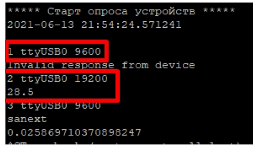 Для проверки работоспособности сбора данных от терморегулятора и теплосчетчика была написана консольная программа на языке Python3, которая периодически опрашивает устройства, указанные в базе данных. Если устройство не найдено, то выводится сообщение «invalid response from device», в противном случае выводятся показания на экран. Результат представлен на рисунке 8.