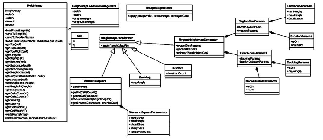 Из-за того, что класс генерации, состыковки и эрозии имеют общее свойство – они изменяют входную карту высот, было принято решение сделать для них общий родительский класс «HeightmapTransformer».
