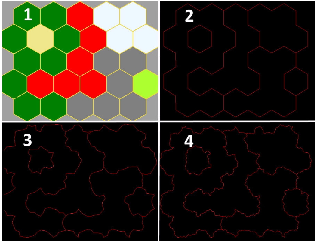 Рисунок 5. Сетка шестиугольников (1), получение полигонов из сетки (2), детализация границ (3, 4)