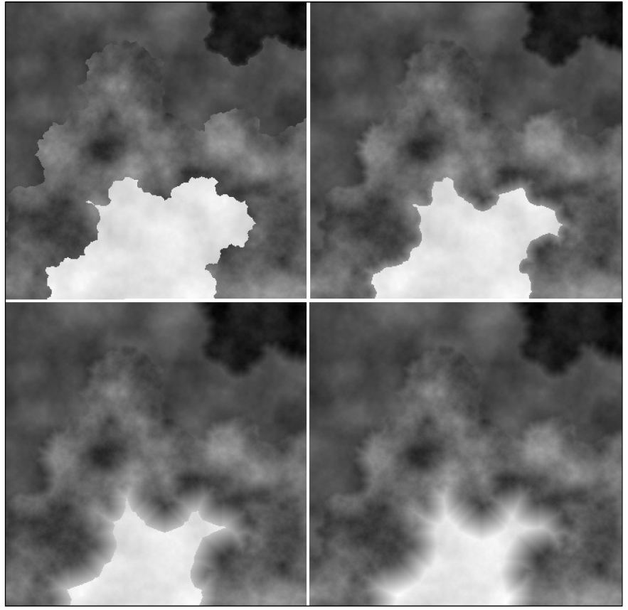 Алгоритм эрозии требует доработки, в виду того, что все ячейки на карте изначально обладают одинаковой «твердостью» и, следовательно, размываются одинаково. Так как в природе есть камни, почва и песок, то можно сделать так, чтобы одни области размывались сложнее, другие – проще.