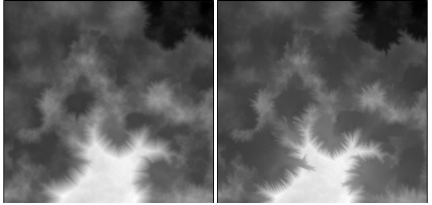 Но ландшафт может потерять свой облик в случае большого значения угла. Если не внести дополнительные изменения в алгоритм, нужную стыковку не провести без повреждения облика всего ландшафта. Для этого на границах областей можно усилить влияние стыковки (то есть, уменьшить максимальный угол), а в других местах – уменьшить. Следует отметить, что данный подход можно объединить с предыдущим, то есть максимальные углы могут быть случайными, но в среднем ниже – на границах, выше – в остальных местах.