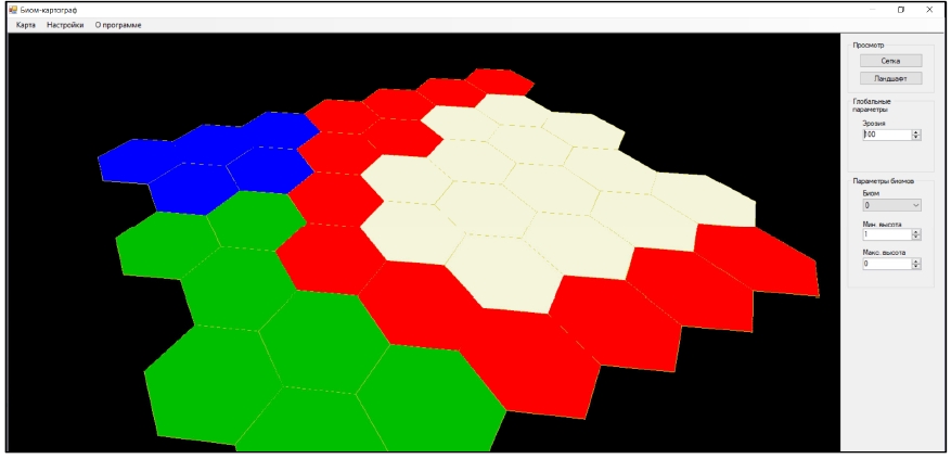 Была разработана небольшая подпрограмма, предоставляющая интерфейс создания и редактирования сетки шестиугольников на плоскости. В ней мы можем выделить биомы, сохранить результат в виде файла, а затем загрузить с целью изменения.