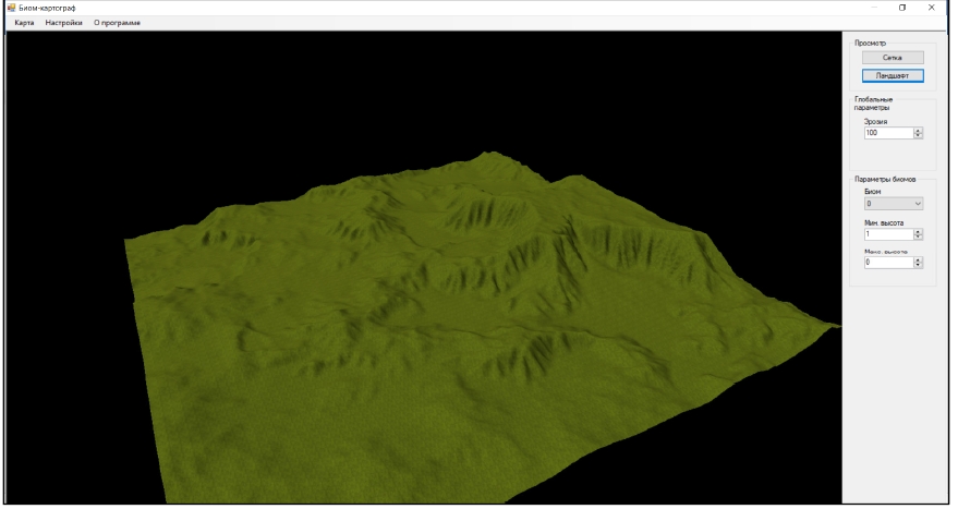 Далее, для запуска генерации следует перейти в меню «Карта» и нажать на соответствующую кнопку. После ожидания, в случае успешного завершения работы автоматически откроется окно просмотра ландшафта, рисунок 11.