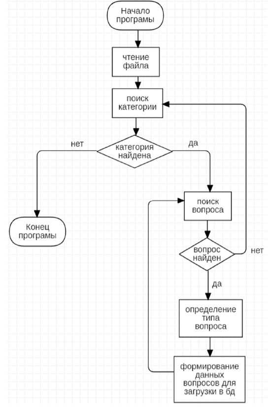 Выгрузка осуществляется в формате GIFT[2]. GIFT – формат данных для экспорта и импорта вопрос для платформы moodle. Она имеет структурированную схему, которая позволяет иметь разделы категории и вопросы. Каждый вопрос имеет свой определенный формат написания вопросов. В платформе moodle можно использовать для взаимодействия с пользователями формат данных GIFT. Для взаимодействия с форматом GIFT используется алгоритм, представленный на рисунке 4.